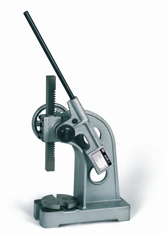 - zbudowana jest z żeliwnego korpusu, stołu i dwóch zębatych elementów, które poprzez dźwignię z grzechotką zapewniają siłę nacisku prasy