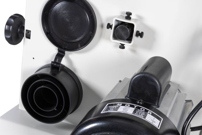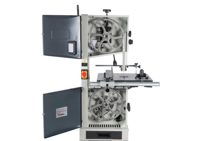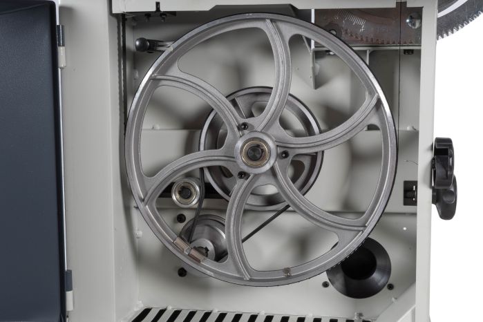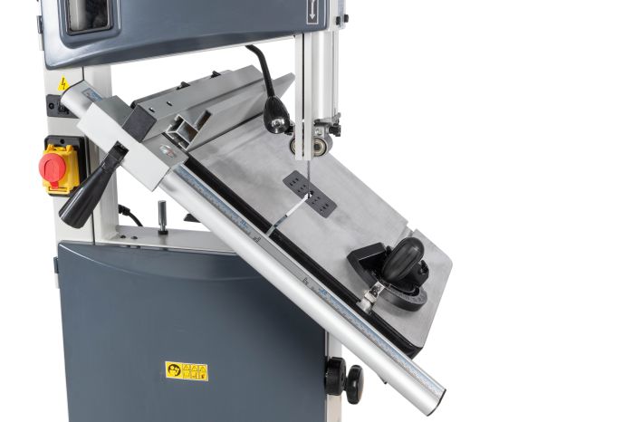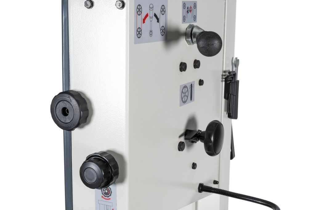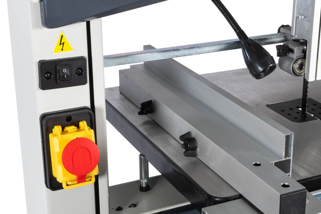 - dodatkowym wyposażeniem tego modelu przecinarki jest wizjer służący do kontroli stanu naciągu taśmy tnącej, oświetlenie powierzchni roboczej oraz przymiar do wycinania okręgów